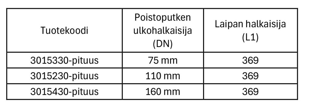 Poistoputken vakiopituudet: 250, 400, 600 ja 800 mm. Muita pituuksia ja putkikokoja saatavilla tilauksesta.